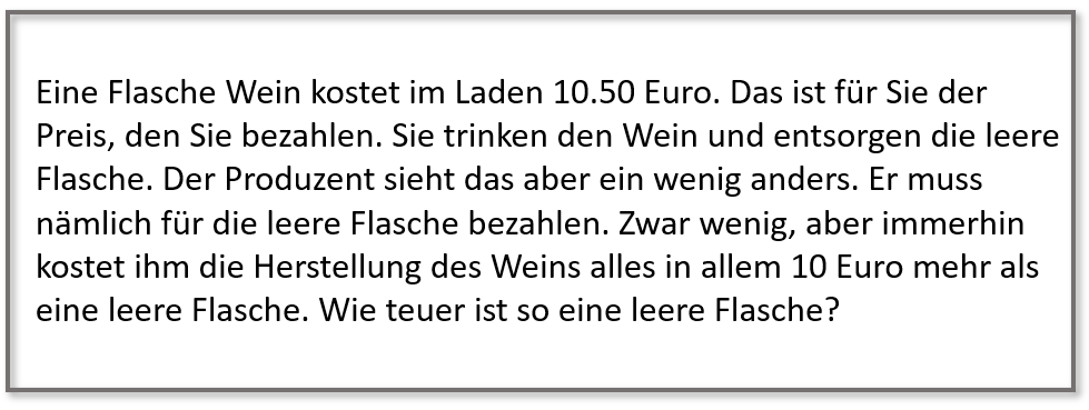 Nachbearbeitung und Lessons Learned: Diese Phase ist ebenso wichtig, wie die Ideengenerierung, wird aber meist aus Zeitgründen und Bequemlichkeit unterdrückt. In der Mathematik besteht die Nachbereitung vor allem aus Qualitätskontrolle, wie man das eigentlich auch im Job so macht. Das Glas kostet also 0.5 Euro, der Wein in der Flasche kostet 10 Euro mehr, also 10.50. Zusammen mit dem Glas kostet die Flasche Wein also 0.5 + 10.50, also 11 Euro…. ääh, wie jetzt genau? Vielleicht habe ich die Aufgabe doch nicht ganz richtig verstanden. Also, fangen wir nochmals von Vorne an!