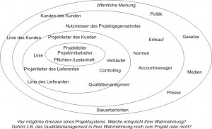 Das erinnert an Luhmanns Standpunkt, nach dem es keinen direkt kausalen Zugriff auf Systeme von aussen gibt. Systeme sind nach Luhmann operativ geschlossen und bestimmen aufgrund eigener Operationen, was systemrelevant ist und was nicht. Das finde ich zumindest für das Projektmanagement ein gefährlicher Standpunkt. Ganz gewiss bestimmt nicht das Projektsystem aufgrund eigener Operationen, was systemrelevant - sprich: projektrelevant - ist. Es gibt kein “Aussen”. Die Unternehmung ist die Welt!