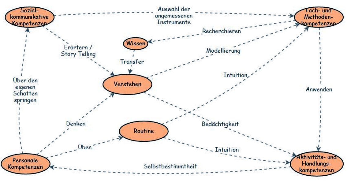 Routine und Verstehen sind neben Wissen zwei sehr wichtige Parakompetenzen, ohne die nichts geht. Allerdings lassen sich gerade diese beiden Parakompetenzen nicht wie Wissen vermitteln. Nur die Lernenden selbst sind in der Lage, sich durch Übung Routine anzueignen und durch Nachdenken Verständnis zu schaffen. Das alleine sind bereits Kompetenzen. Wir benötigen also (personale) Kompetenzen, um Parakompetenzen aufzubauen, die Voraussetzung sind zum Erwerb vor allem von Fach- und Methodenkompetenzen sowie Handlunskompetenz. Insofern sind die vier Kompetenzkategorien nicht so flach, wie sie Erpenbeck und Sauter vorstellen. Vielmehr hängen die Grundkompetenzen, die von den Parakompetenzen zusammengehalten werden, via Metakompetenzen voneinander ab, wie z.B. Denken, Üben, Anwenden, Modellieren, etc.
