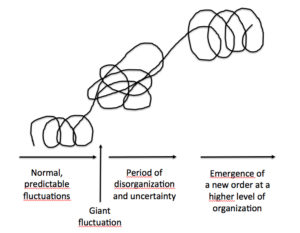 Insofern könnte man die ersten beiden Punkte in Jantsch’ Aufzählung zusammenfassen. Spannungen entladen sich in Störungen, sogenannter “Fluktuationen”, modern auch Disruptionen genannt. Sie ordnen das System durch Selbstorganisation neu.