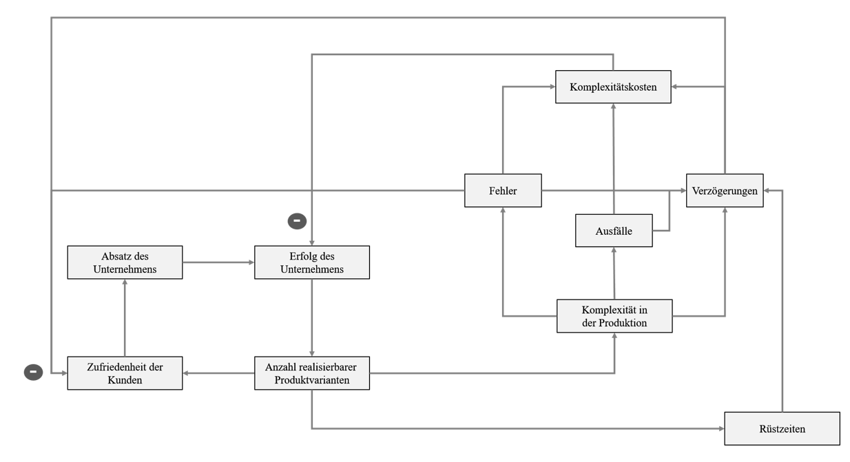 Über eine statische Analyse mittels geeigneter Software lassen sich in einem weiteren Schritt wirksame Hebel im Wirkungsgefüge identifizieren. Dies sind in unserem Beispiel insbesondere die Faktoren „Fehler“, „Komplexität in der Produktion“ und auch die „Anzahl der realisierbaren Varianten“