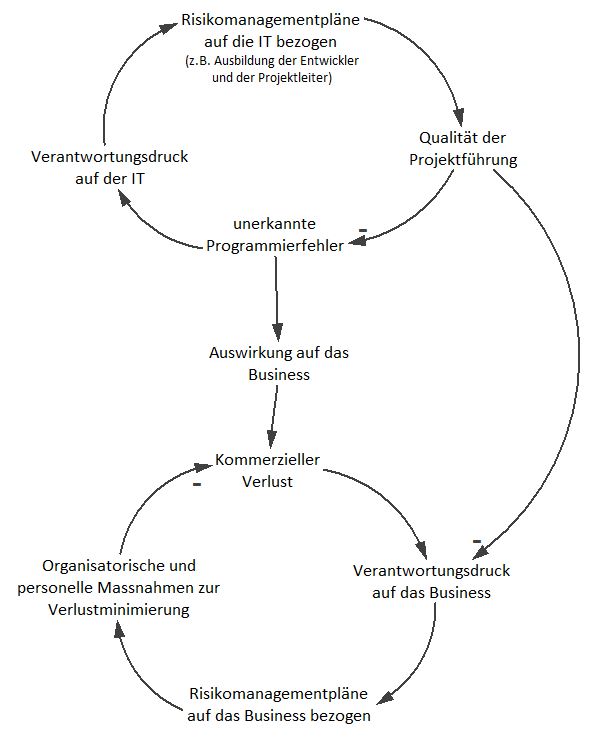 Wie immer ist der Weg zu der fundamentalen Lösung steiniger und mühsamer, als derjenige zu der symptomatischen. Daher wird dieser bevorzugt. Mit der Delegation der Verantwortung an die IT, entmündigt sich der Auftraggeber selbst, denn je mehr die symptomatische Lösung präferenziert wird, desto unwahrscheinlicher wird es, dass der Auftraggeber die fundamentale Lösung überhaupt versucht. Der Pfeil, der von der “Qualität der Projektführung” zum “Veranwortungsdruck auf das Business” führt, verringert letzeren Parameter. Je besser und kompetenter die Projektführung, desto unnötiger erscheint es, dass sich das Business zusätzliche Gedanken zum Risikomanagement macht. Was kann denn bei zertifizierten Projektmanagern noch schief gehen?